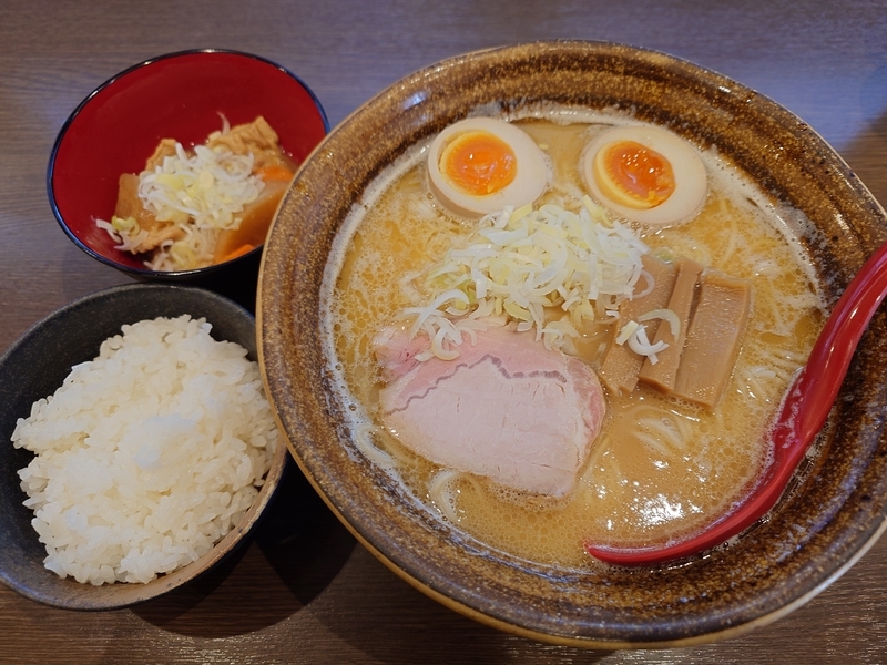 金沢市米泉町の秋生跡地にできた麺しも谷で、鶏白湯そば(大盛)、もつ煮、ライス(小)
